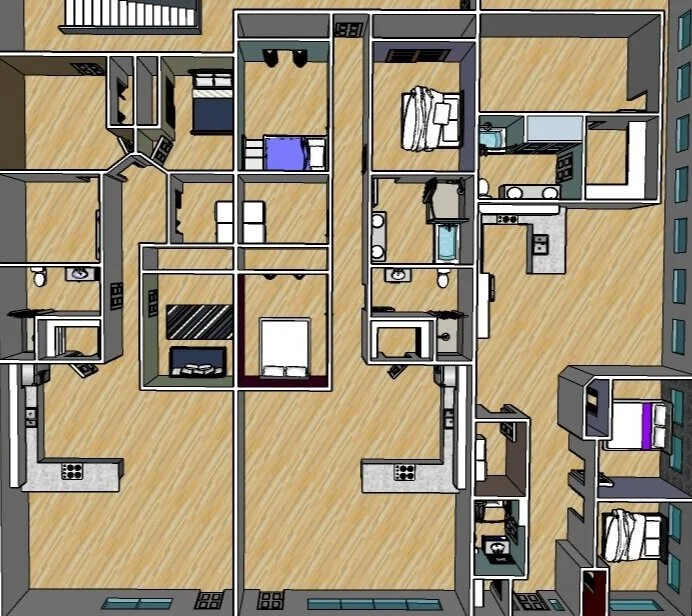One of the major components in this project was putting together the floor plans for the apartment. The apartment requirements were three bedrooms, two bathrooms, one laundry room, a kitchen, a dining area, and a living room.