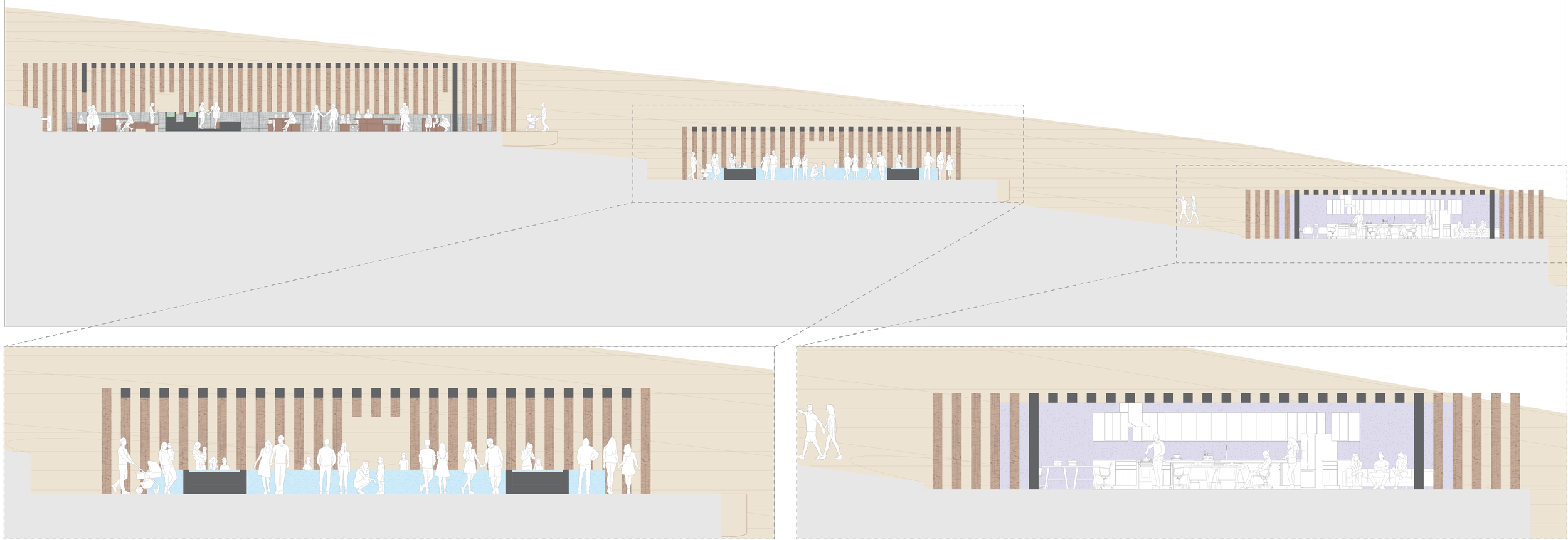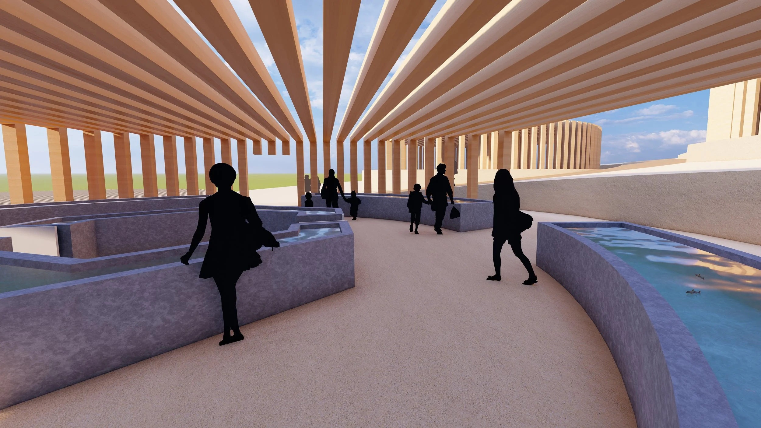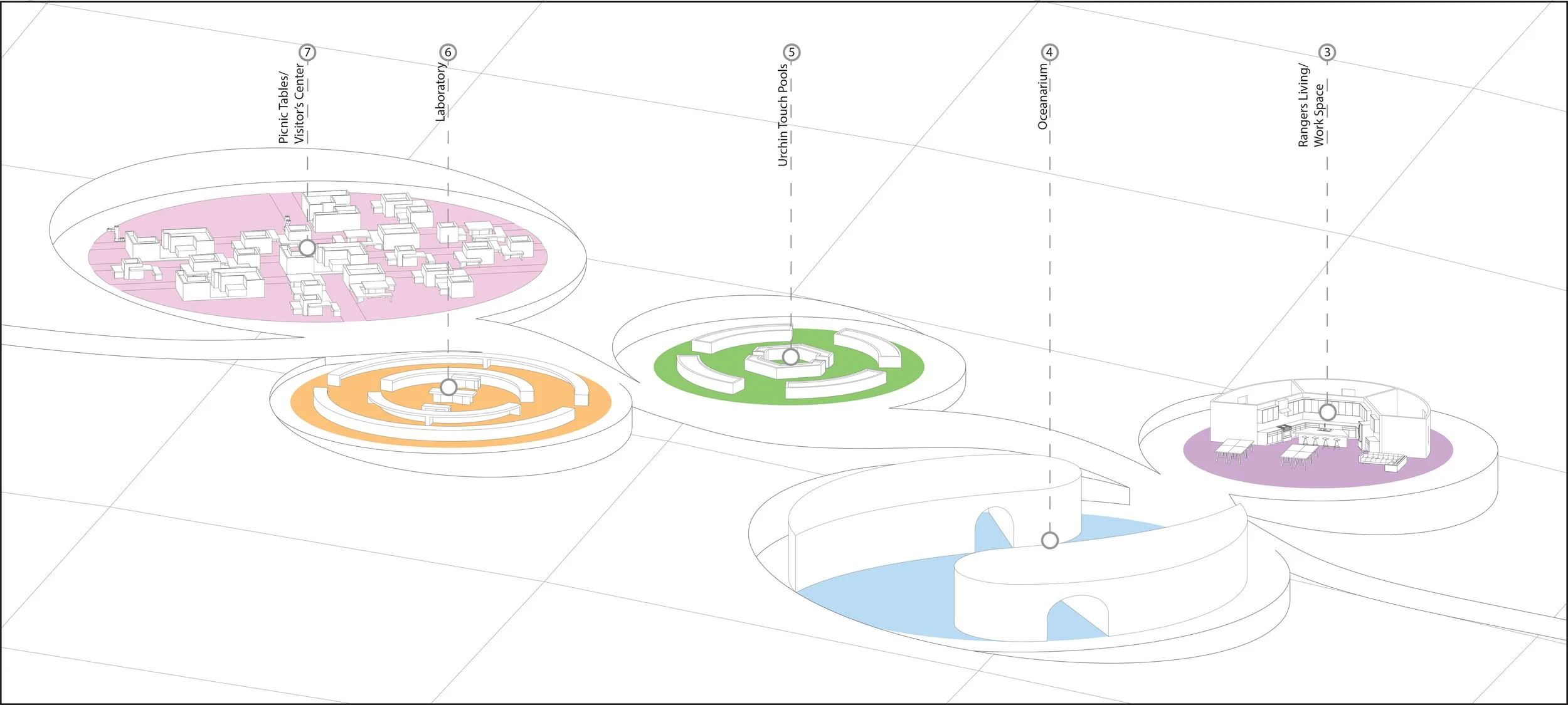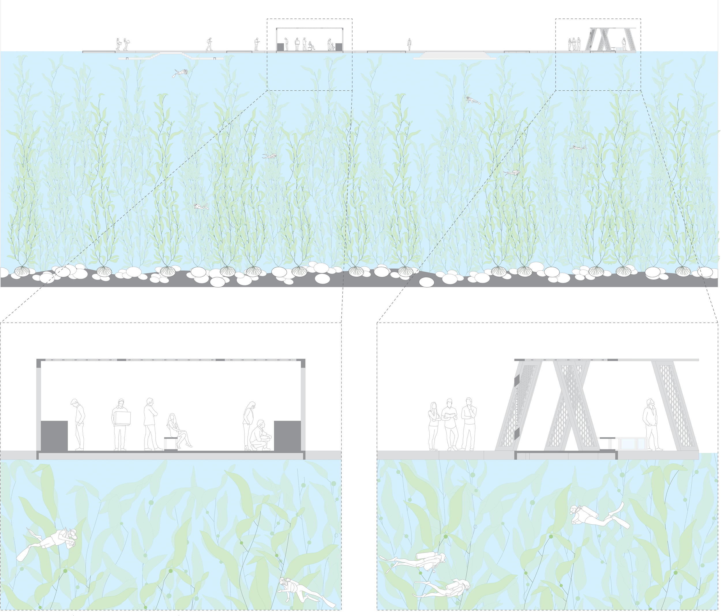 (4) The oceanariums will allow guests to be submerged in the world of the kelp forest without ever leaving land. It is the perfect space for visitors to learn about the fish that live amongst the kelp and be able to see what the growing kelp looks like.