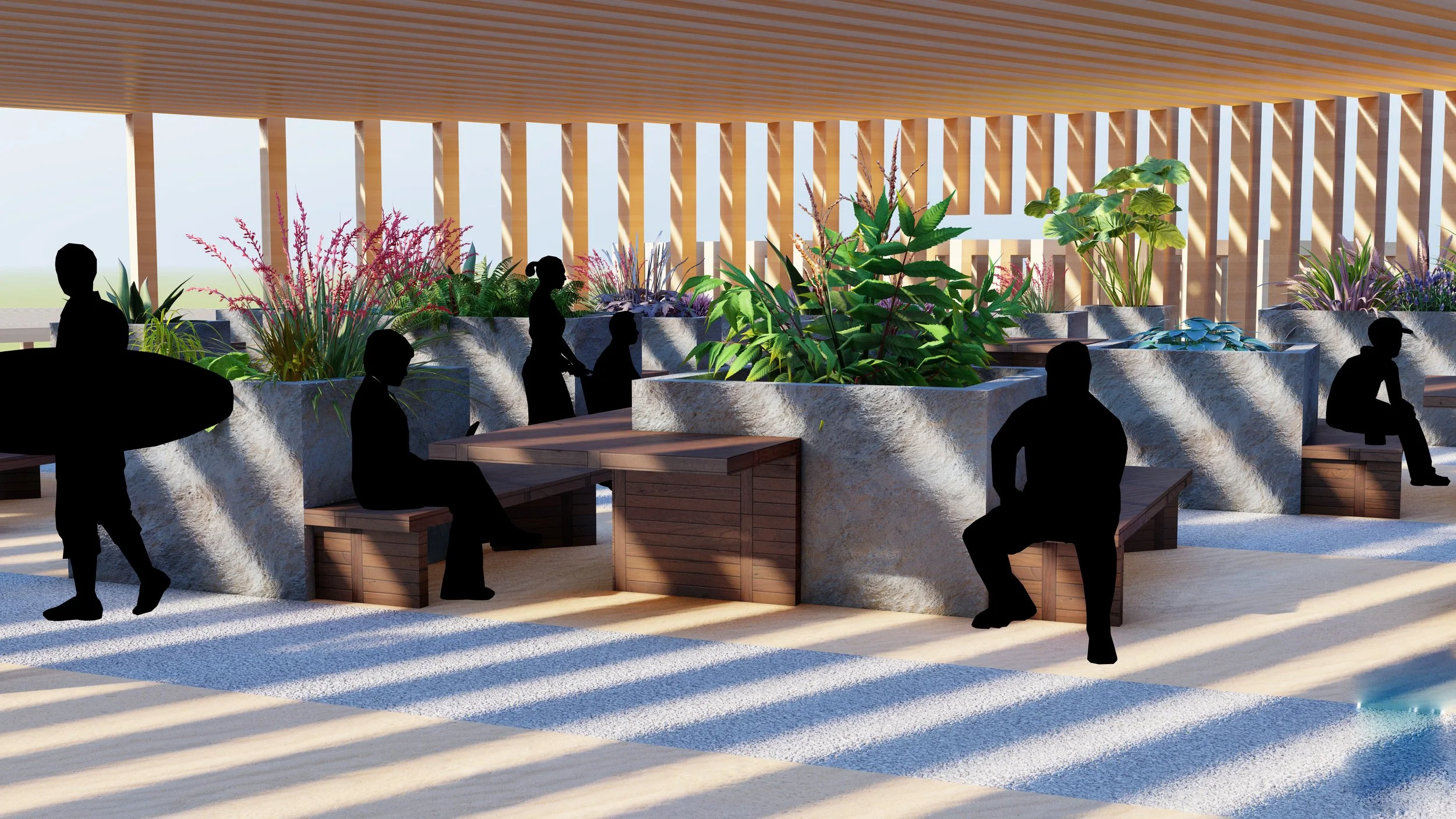 There are docks on the eastern side of the platform facing the beach for easy access for the boats bringing in the researchers and other guests. Once the boats are docked, people can either follow the right or left paths down to the various view points or the can follow the center path shown in the section on the left. This center are has benches, lockers, and air tanks for anyone who is diving off the platforms and into the kelp forest.